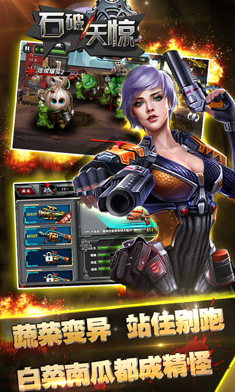 石破天惊是一款射击作品,游戏的画质是很精美的,而且里面的角色也是令人非常的喜爱,这些敌人都是变异的蔬菜,每个关卡中的敌人都是不同的,玩家们需要用各种不同的方法击杀它们,拿起你的强力武器和变异的蔬菜怪物展开对决,挑战海量强力的关卡,还可以选择热血的PVP竞技模式,体验枪枪爆头的快感!