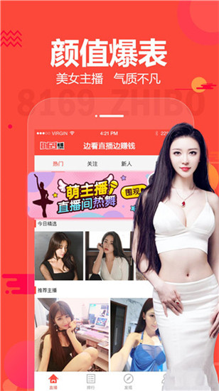 8169直播是一款汇集了海量优质真人美女主播的直播平台,为用户提供实时精彩有趣的直播服务。在应用中为用户提供每天24小时不间断的精彩直播内容,让用户可以轻松直播,在应用中用户可以体验主播为用户带来的不一样的生活体验,让用户使用手机直播的形式体验别人的人生,不出门吃遍天下美食、不出门游遍大江南北,领略江南的文人风骨,瞻仰红色革命遗址,感受各个地区不一样的风土人情,绝对满足你的所有需求!在线视频直播交友,随时随地和主播互动,你可以在线与主播聊天互动,还可以认识更多有趣的新朋友,扩大自己的社交圈,给生活带来更多乐趣.随时随地用手机与主播互动,游戏、K歌、聊天等频道,自由选择,丰富你的娱乐生活!精美的设计风格、高颜值的美女主播、好看的才艺表演让你充分享受看直播的过程。喜欢看美女主播的可以下载哦!