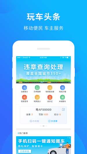 玩车头条Apppcation是你的违章查询助手。玩车头条Apppcation提供全国车辆违章查询、违章处理、驾驶证查分、查违章相片、一键挪车等功能,车主无忧。