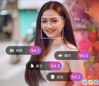 1.颜值测试功能,基于人工智能及大数据分析你的面容,依据眼睛、嘴巴、鼻子、脸型等维度计算颜值。