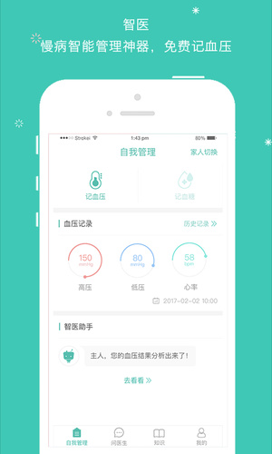 智医Apppcation是一个以大数据驱动的人工智能慢病管理大厅,智医Apppcation为慢病患者提供全方位健康服务,智医Apppcation包括自我检测、在线问诊、健康科普,智医Apppcation旨在帮助患者改善健康,智医Apppcation可提升慢病管理的能力,让每个人都能做自己的医生,加大社会对慢病的关注!