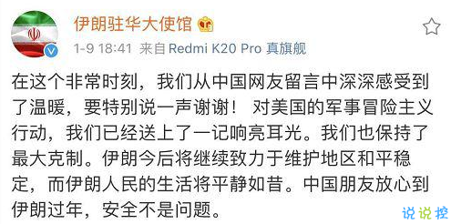 在这个非常时刻,我们从中国网友留言中深深感受到了温暖,要特别说一声谢谢! 对美国的军事冒险主义行动,我们已经送上了一记响亮耳光。我们也保持了最大克制。伊朗今后将继续致力于维护地区和平稳定,而伊朗人民的生活将平静如昔。中国朋友放心到伊朗过年,安全不是问题。