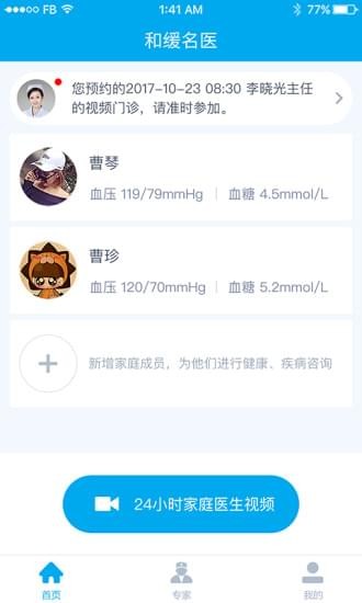 和缓名医提供7*24小时家庭医生视频服务,用户一键视频即可咨询家庭医生,医生一分钟响应,无需排队挂号,无需填写繁琐信息,全家人可共享家庭医生服务,节约看病时间及花费。