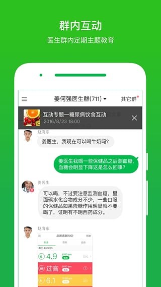 以医生群为核心,每周1小时的周主题互动,患者结合主题根据自身提问,医生解答患者疑问,并对血糖报告进行指导。