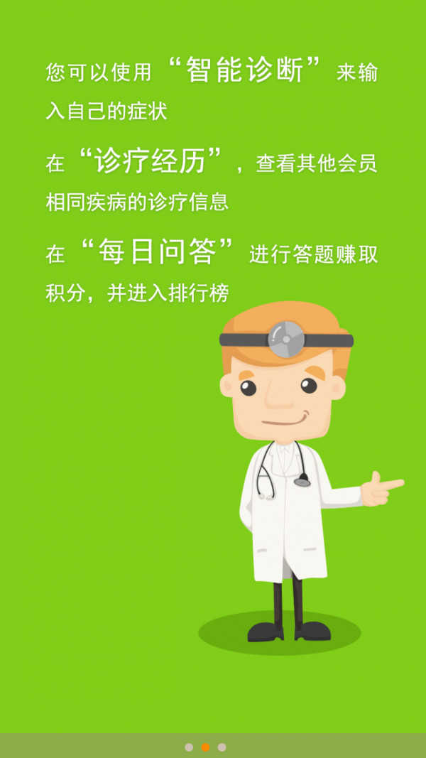 1、我的医疗安卓版包括智能诊断,诊疗经历,每日答题,个人中心,我的医疗等功能模块。