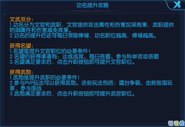 想要提升功名,获得更高的官阶,就需要玩家获取名望和武勋,名望和武勋达到要求的数量,就能获得更高的官阶了,名望的获取需要玩家达成成就,参与每日答题、科举活动等,武勋的获取则需要玩家参与PVP,包括擂台争霸,击败敌国玩家,参加国战等。