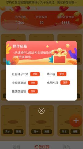 2、【红包庄园】用户可以将获得的活力值购买种子进行种植,可以长出红包,开启红包获得随机现金奖励。