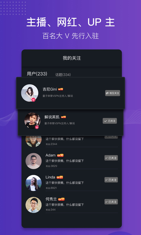 超过2000位来自抖音、快手、B站、微视、西瓜视频、火山小视频、好看视频、优酷土豆、出彩短视频、360块视频、pke短视频、斗鱼、虎牙、企鹅电竞、YouTube、Twitch、微博视频的游戏达人、主播大咖、二次元人气UP主入驻,各路大神组团带你飞!