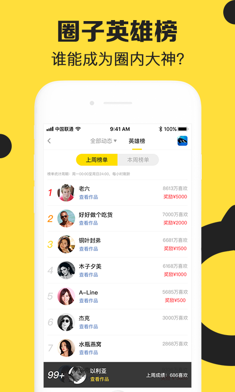 3、决战英雄榜,瓜分巨额奖金:上传小视频收获万众瞩目,还能赢现金大奖,这么美好的事只能便宜你了。