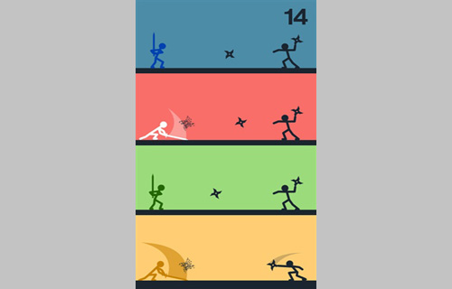 每个分道分别有一个火柴人作为对手,不断向目标火柴人扔手里剑,手里剑飞过来了就要发动攻击。