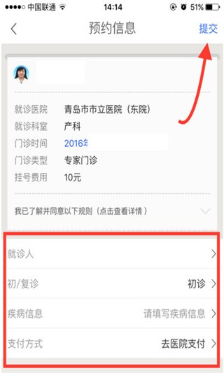 6.填写自己的就诊信息,点击右上方的“提交”。