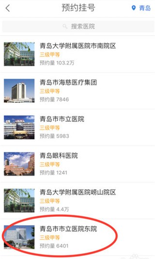 2.选择你要去就诊的医院。这里我们以青岛市立医院东院为例。点击医院进入。