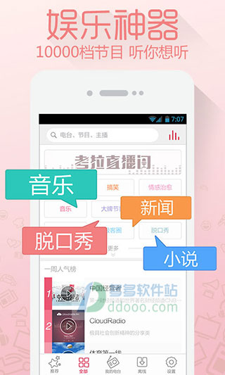 考拉fm安卓版有超过2000档保持更新的节目,超过50000集的有声读物内容;并且与国内1000多家电台、500多名DJ或脱口秀主持人进行长期深度合作,同时与网易新闻客户端,搜狐新闻客户端,百度语音助手,北京晚报,Wemedia等机构合作,为用户制造优质内容。考拉FM的节目内容十分丰富,现有语言节目120档,咨询节目63档,音乐节目120档,有声读物1万期,其中既包括常规的脱口秀、音乐、资讯、段子等节目,还有明星大咖、网络红人、男神女神、