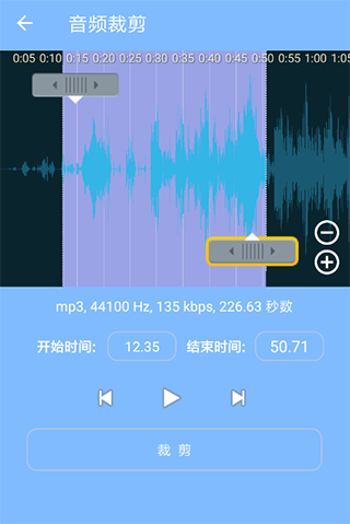 2、以“音乐裁剪”为例子,进入其中选择手机本地的音频文件,滑动上方的进度条选中需要剪辑的片段,点击“裁剪”按钮保存即可。