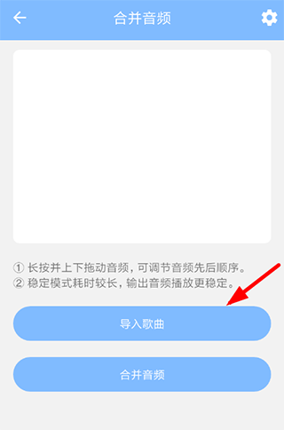 4、打开“音乐合并”页面后,大家还能够导入多个本地音频文件进行合并,长按并上下拖动音频,就可以调节音频的先后顺序!