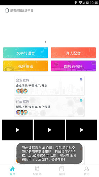 配音师安卓版是一款应用于安卓端的可支持任意文本内容的配音工具,由长沙原力网络科技有限公司独立研发,不依靠电脑PC,全部手机完成录音剪辑、视频剪辑合并,视频剪辑制作,长视频剪辑、小视频合并,自主配音,自选本地和视频编辑软件音乐等操作,且具备海量样音模板文案,优质背景音库,是您地摊叫卖、广告促销、商场宣传活动合成配音,或者个性听书、彩铃制作、儿童配音,不可或缺的掌上应用。该工具全程傻瓜式操作,多达百种的男女配音和方言配音均出自配音大师精心铸就,甚至可以选择好的专业的背景音乐以及不同的配音声优的声音自能配音。相比其它配音软件,如果用户想要让效果更加专业和出彩,那么它将是您可靠地帮手。小编带来的是配音师修改版,此版本感谢大神[水梦]完美修改,登陆帐号即享VIP功能,省去会员价格500元的开销,欢迎免费下载。