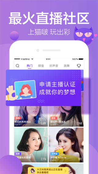 猫啵app是由花椒直播于2018年5月28日宣布推出的一款全新的泛娱乐社交直播平台,该平台内容涉及明星发布会、花边新闻、才艺展示、生活趣闻、聊天互动等众多领域,能与花椒直播双线运营,构建多维直播生态。猫啵直播app上线之初得到了花椒在公会主播资源、流量、技术、运营推广等方面的全面扶持,不仅吸引了姿瓣、热度、华星、冰点、MJ等数十家知名公会入驻,更有来疯大主播兵子、裤衩、韩冷先生,奇秀大主播吴所谓和陌路,红豆等主播与平台签约。直播唱歌、跳舞、脱口秀、户外,以及美女直播视频秀表演,只有用户想不到的没有这里不提供的,欢迎感兴趣的朋友前来本站下载体验。