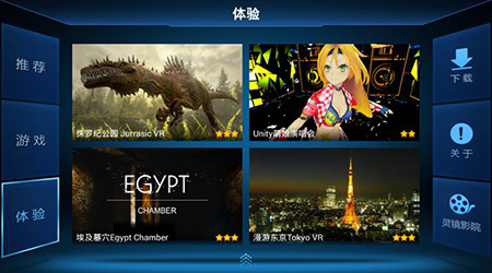2、灵镜世界,需要通过触屏来进行操作,点击右下角的灵镜影院图标可以直接下载或者跳转到影院APP,需要注意的是手柄要保持连接状态才能够在灵镜影院中进行对应的操作。
