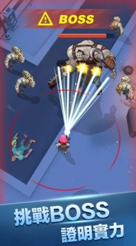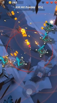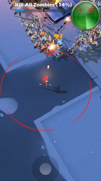游戏中你会拿着人类托付给你的最重要的武器与装备,这些能够保护你自己;冲着丧尸群开火就完事了,游戏开始会使一些不堪一击的杂兵,僵尸boss会在后面出没,那个已经不能用僵尸boss来形容了,简直就是巨型怪兽,面对它们你要尝试打远距离作战,近身搏斗容易遭受攻击,它的全力一击你可能会倒地不起;只需要控制人物的走位即可,人物周围的红色圆圈是他的火力范围,进入该范围的僵尸会自动开火。