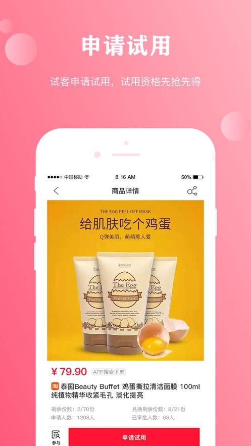 1、提供了可以免费试用的机会,在平台上来进行领取,商品也非常的丰富,海量的优质商品,每天可以进行试用。