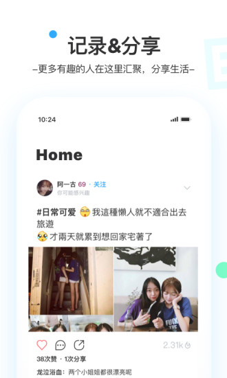 首页的功能主要就是发内容、视频、和展示信息流。从用户操作上来说还算简单,发内容和视频的时候,操作容易上手。但是信息流布局并不够美观,稍微有点凌乱信息推送是软件自我推送的,如果可以排版清晰一点,供用户自己选择,我想体验效果会更好一点。