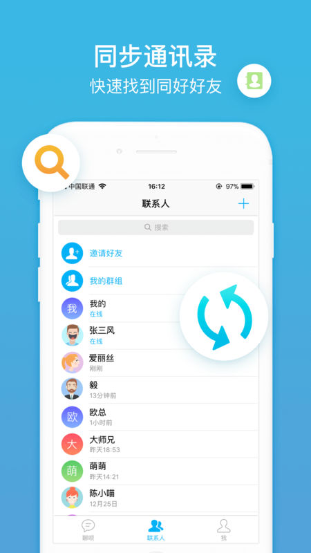 1、下载安装聊呗后,只需输入手机号码及验证码,即可与手机通讯录上的好友聊天。