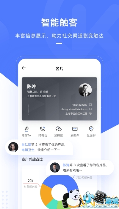 一张名片展示个人与企业全面信息,助力销售以内容传播获取线索;轨迹追踪让销售对客户需求了如指掌。