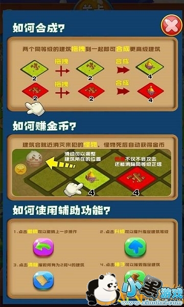 每次移动,棋盘上所有的宠物会移向划动的一侧,同时增加一个宠物,相同的宠物会相加合并到一起,可以通过升级建筑地狱怪物。