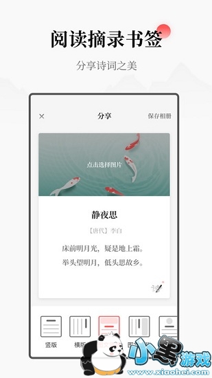 每日诗词提供制作阅读摘录书签,自行选择喜欢的诗词篇章或者诗词句子制作成书签,选择切换书签皮肤,分享给朋友一起阅读。