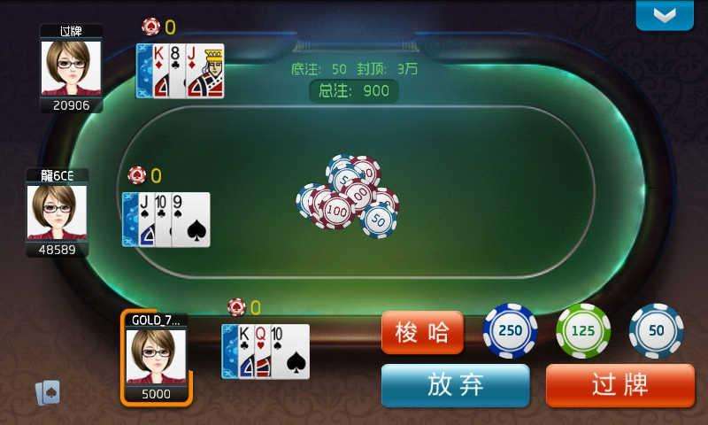 6、牌面最大的人可赢得桌面所有的筹码。当多家放弃,已经下的注不能收回,并且赢家的底牌不掀开。