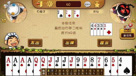 3人玩,一副牌54张,一人17张,留3张做底牌,在确定地主之前玩家不能看底牌(3张底牌在屏幕正上方扣著显示)。确定地主后,底牌亮出,显示在屏幕正上方