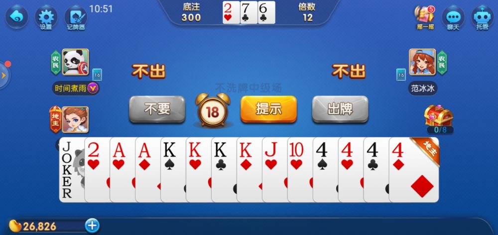 嘻嘻斗地主安卓下载-嘻嘻斗地主最新版下载将三张底牌交给地主,并亮出底牌让所有人都能看到。地主首先出牌,然后按逆时针顺序依次出牌,轮到用户跟牌时,用户可以选择“不出”或出比上一个玩家大的牌。某一玩家出完牌时结束本局。