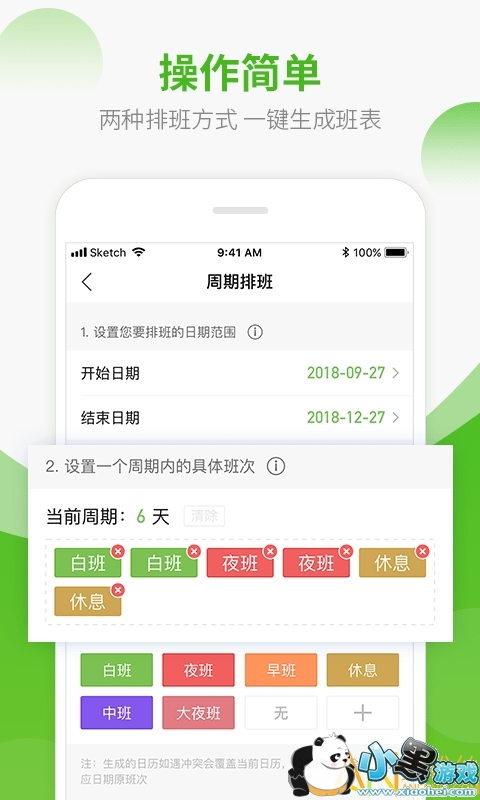 周期和手动两种排班方式,分别针对周期固定和不固定的工作人群;操作流程简单,可根据一个周期的工作安排自动生成专属工作班表