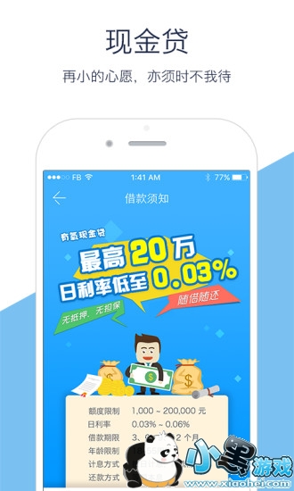 申请便捷,无需面审,仅需简单基础资料,即可完成申请和借款。额度最高20万,日利率低至0.03%,随借随还,无任何手续