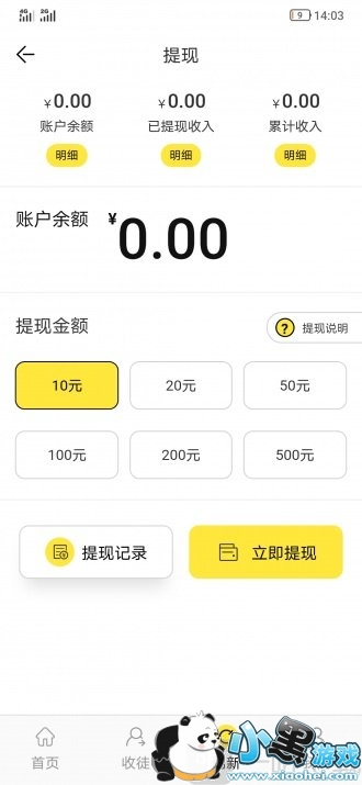 1.提款门槛很低,收入超过10元可以提取现金,方便快捷。