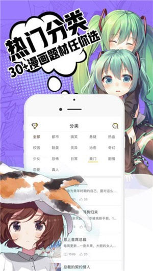 2、有着丰富国产动漫、日本漫画!十万本热门漫画全集、50 漫画分类随你选、漫画新闻资讯每日周刊!