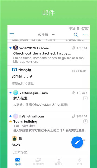 YoMail是一款支持各大主流邮箱软件整合的邮箱辅助工具,使用YoMail你可以一键添加你的各大邮箱,让你一个软件就能收到来自多个邮箱的信件,并且还能跟普通邮箱关键一样进行写信和回信,还可以管理你多个邮箱的通讯录,非常方便。轻松发送更多邮件,操作简单。赶快来下载YoMail邮箱安卓客户端体验一下吧。