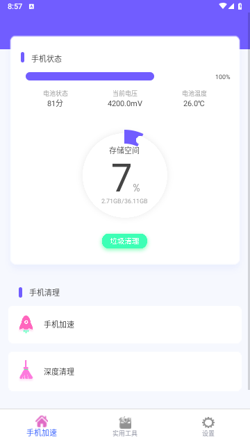 1、专注于手机垃圾清理、内存释放、运行加速等功能模块;