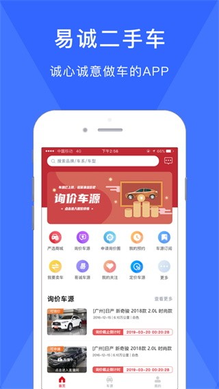 易诚二手车app是专业的二手车交易平台软件,是广州易诚拍卖有限公司为车主打造的汽车买卖置换一站式服务平台,拥有非常丰富的优质二手车资源,交易安全,环节透明。翼城车汇基于东风日产、东风启辰、东风英菲尼迪等4S店的实际服务场景,并拥有二手车检测标准,拥有128项独有的出厂合格证检测项目,整合客户管理、车辆管理、库存管理等智慧4S功能,帮助4S门店全面提升二手车专业服务能力。给更好的购车体验。