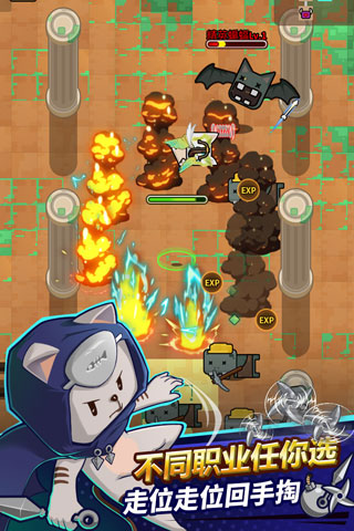 1、复古经典的动画风格,各种萌Q萌地牢生物,9只萌猫,各有3个独特的技能和炫酷华丽的技能效果;