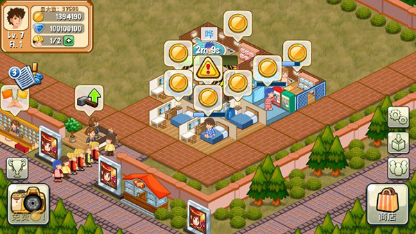3、例如,您可以收集客人消费后显示的金币,或者如果金币足够多,前台会出现一个向上的箭头,点击后即可升级,或者您可以点击不同的建筑设施进行旋转升级。这很简单;