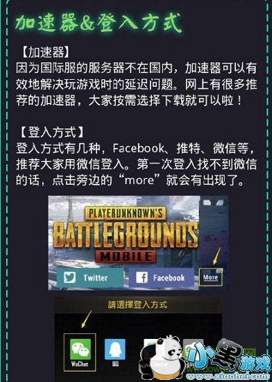 刺激战场国际服支持推特、facebook、微信、qq等多种登录方式,第一次登录游戏时,如果找不到微信、qq登录,点击旁边的“more”,大家就会看到的。如图所示: