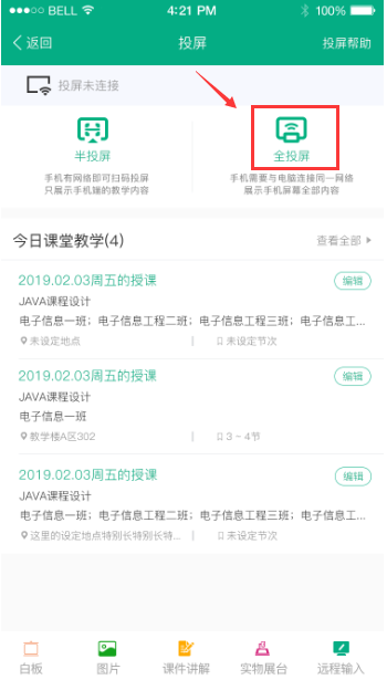 登录教师APP,点击左上角投屏按钮进入投屏选择页面