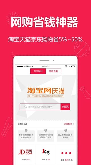1.最省钱:淘宝、天猫、京东等600多家知名商城购物返现金,最高返利50%。