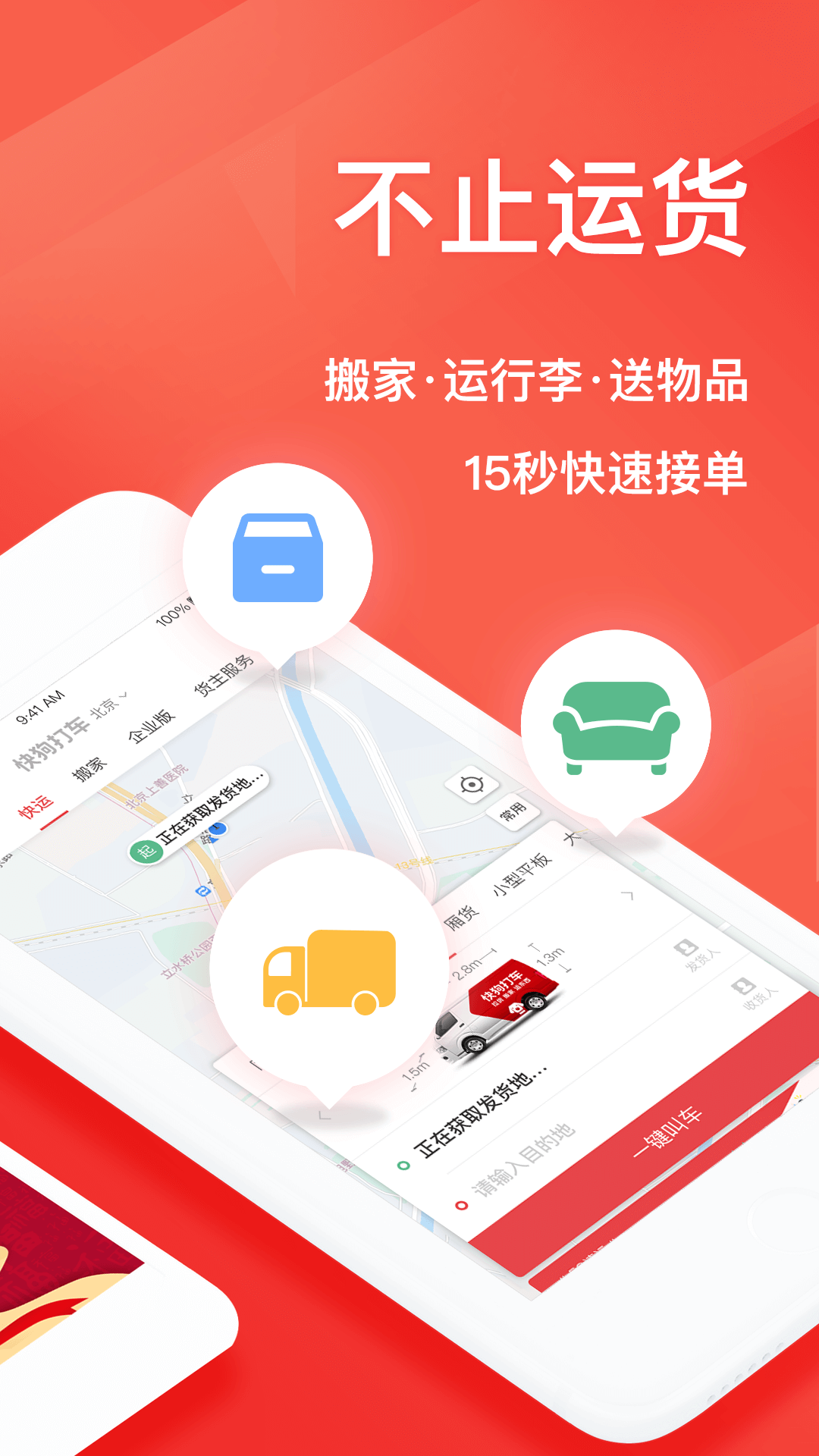 快狗打车是一款非常便民的叫车软件,快狗打车打来的不是普通的私家车,是货运车,专业的司机配送,各种货物都可以安全送达,快狗打车由58速运改名而来,支持手机一键叫车,司机快速响应。