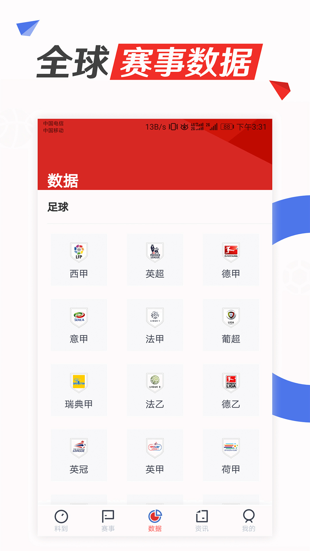 超全的赛事数据,覆盖全球超过200个国家或地区,1000多个各级赛事各类足球、篮球赛事的比分即时数据、历史数据分析!