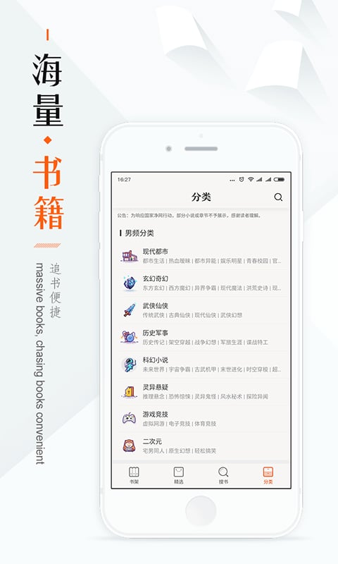 穿越、言情、灵异、文艺、传记等多个分类。