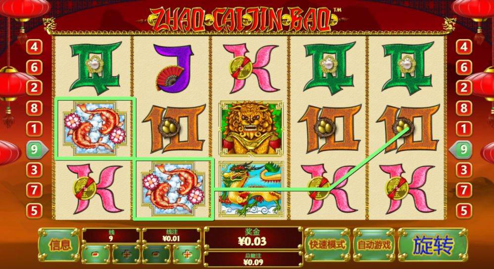 3.符号在赔付线上从左到右和从右到左排列都能赢奖。赢奖组合必须从最左侧或最右侧的转轴开始,而且符号必须连续排列。如果多条活跃的赔付线出现赢奖组合,则奖金会相加。