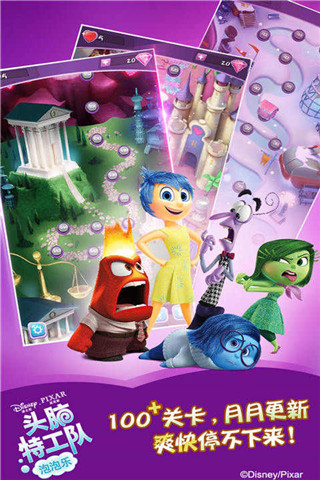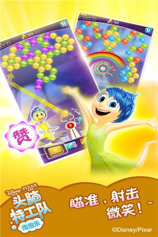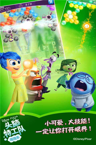 《头脑特工队:泡泡乐》是一款由迪士尼动画电影《头脑特工队》改编的泡泡龙游戏。《头脑特工队:泡泡乐》将5个主角和其能力融入到游戏中,玩法简单上手,画面精致,游戏还原电影场景。玩家需要选择主角并通过消除泡泡来调整情绪通过关卡。游戏有4种通关模式,玩家要按照要求才能过关。