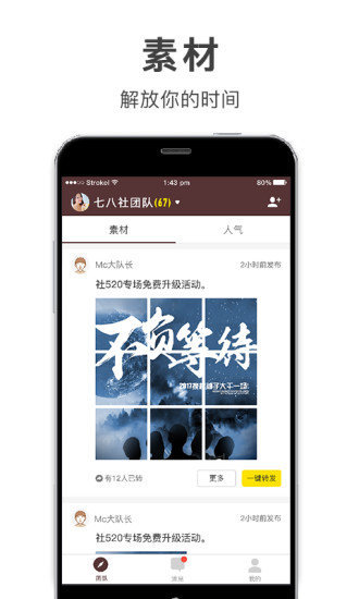 七八社是一个专为微商团队服务的APP,有效地解决微商团队的管理、培训、沟通等问题。提高成员活跃度,打造百万铁军团队。